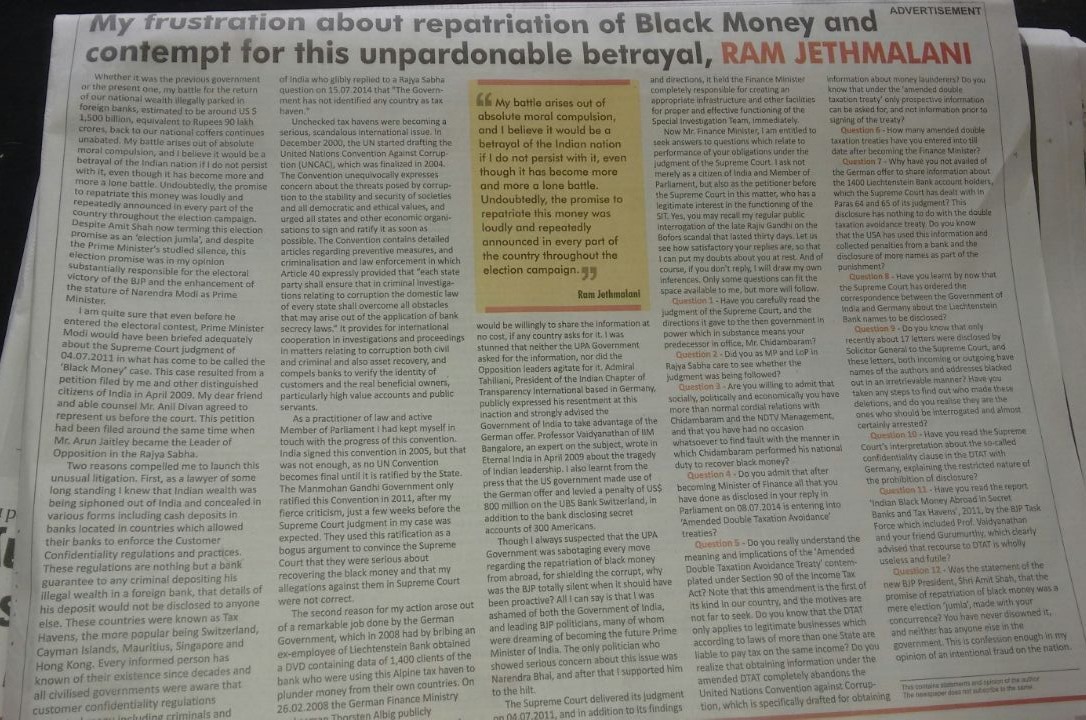 In October 2014, the newly sworn in NDA government, much like the previous incumbent, sought to take cover under the DTAT to stall the disclosure of foreign account holders, making Mr.Jethmalani furious.