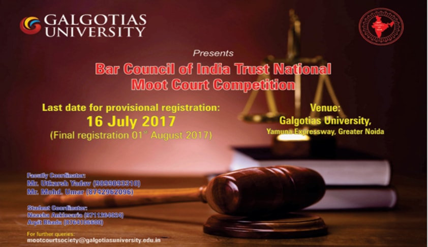 School of Law, Galgotias University shall be hosting the 34th- Bar Council of India Trust- Inter-University Moot Court Competition from 25-27 August 2017.