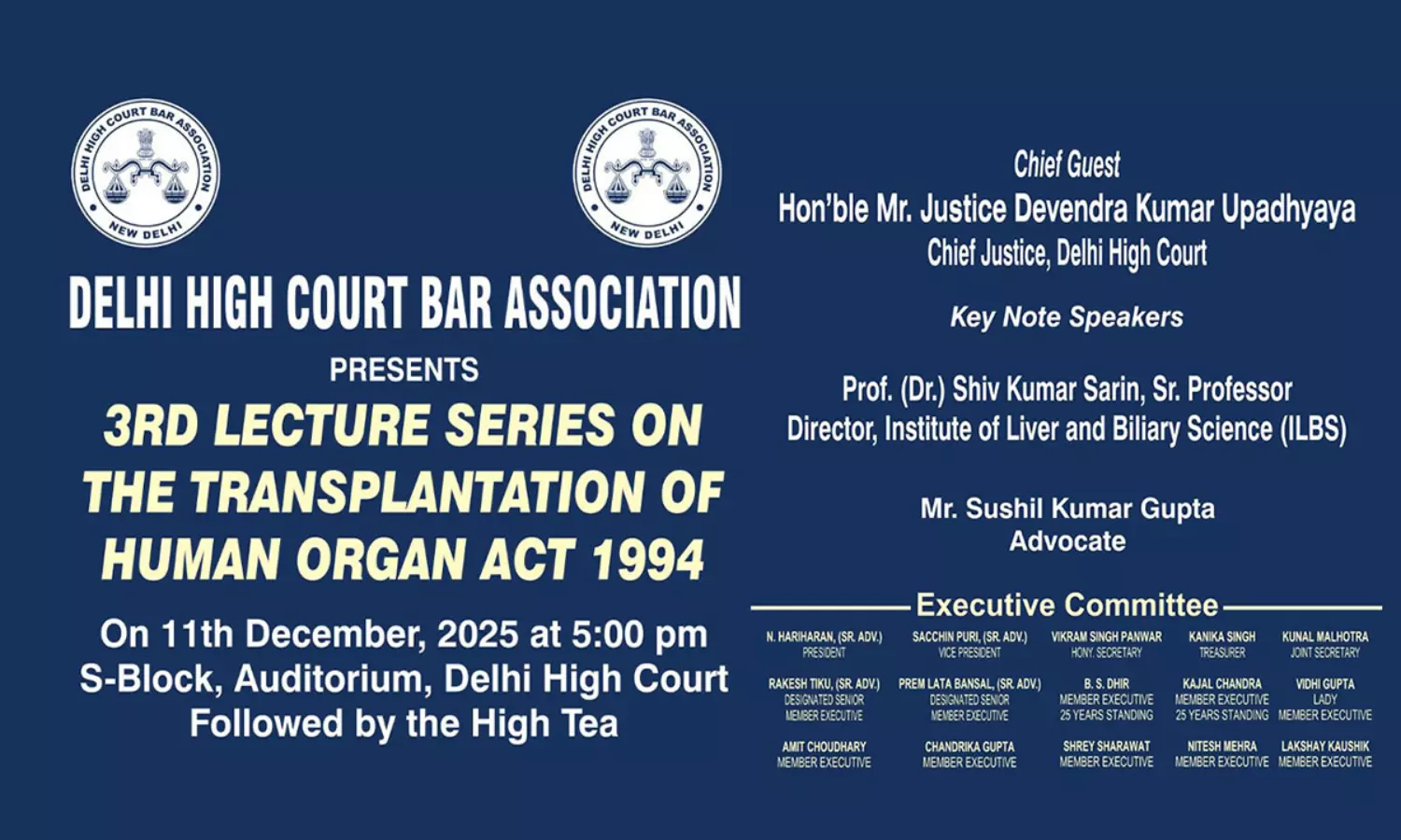 The Delhi High Court Bar Association (DHCBA) is organising the 3rd Lecture Series on the Transplantation of Human Organ Act, 1994 on December 11, 2025, at 5:00 PM in the S-Block Auditorium, Delhi High Court.