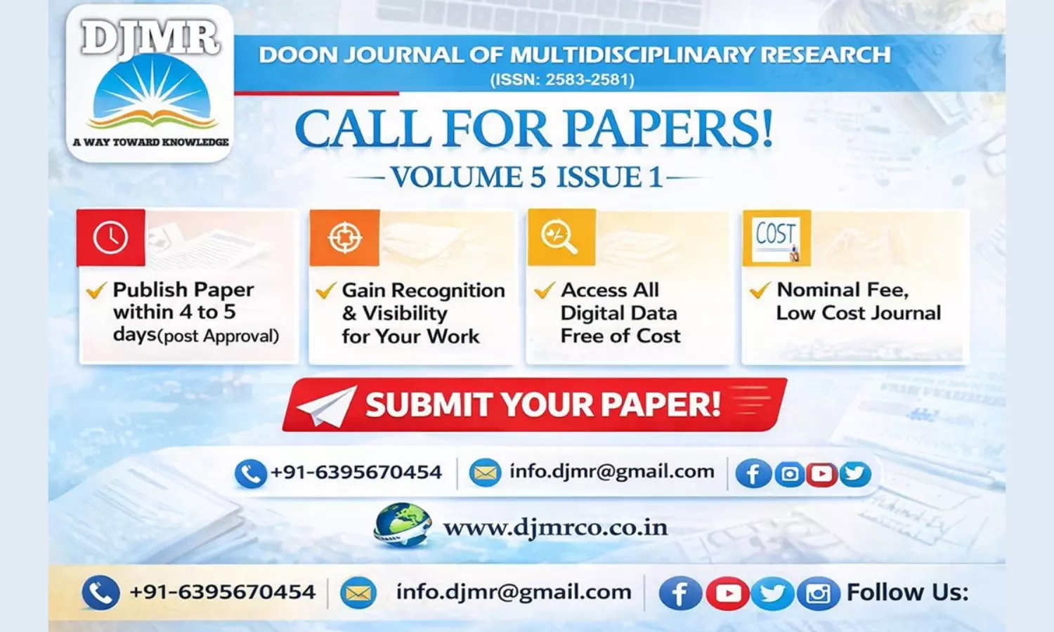Call For Papers: Doon Journal Of Multidisciplinary Research [Vol 5, Issue 1, E-Issn: 2583-2581, Indexed Journal]: Submit By March, 30