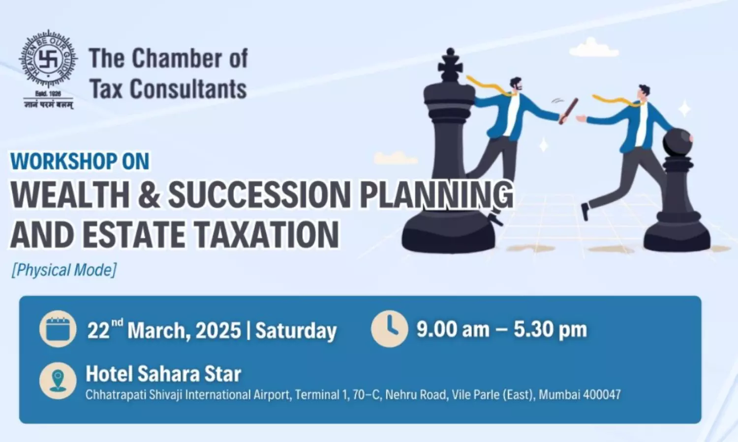 The Chamber of Tax Consultants is inviting all to enroll for the upcoming workshop on Wealth & Succession Planning and Estate Taxation. This full-day, in-person event is designed in an advanced workshop format which will delve into essential topics such as wealth and succession planning, legal and regulatory frameworks, estate taxation, FEMA provisions, and more. Our esteemed speakers and expert panelists will share valuable technical insights including through practical case studies and strategies to help you navigate these complex areas.