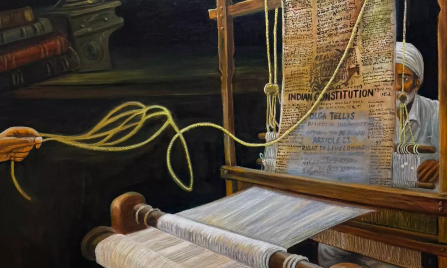 Several paintings drew inspiration from some of the most significant rulings in India's constitutional history. Among them was the Supreme Court's decision in Kesavananda Bharati v. State of Kerala, which established the “basic structure” doctrine, limiting Parliament's power to amend the Constitution. Artists interpreted this doctrine through visual motifs representing balance, resilience, and the foundational pillars of constitutional democracy.