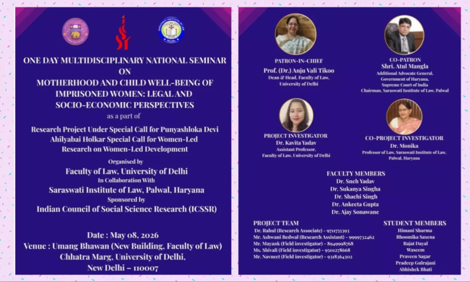 A one-day multidisciplinary national seminar on “Motherhood and Child Well-being of Imprisoned Women: Legal and Socio-economic Perspectives” will be organised by the Faculty of Law, University of Delhi, in collaboration with Saraswati Institute of Law, Palwal, Haryana. The seminar is sponsored by the Indian Council of Social Science Research (ICSSR) and is scheduled to be held on May 8, 2025, at Umang Bhawan, Faculty of Law, University of Delhi.