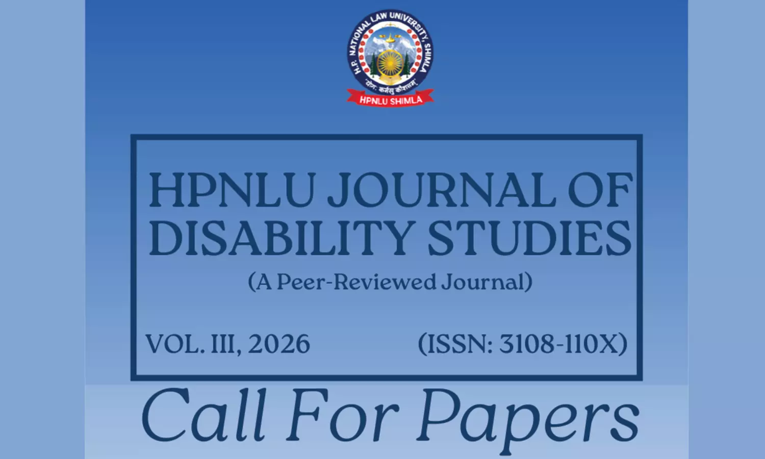 The HPNLU Journal of Disability Studies (ISSN: 3108-110X) invites original and scholarly submissions for Volume III (2026) from academicians, researchers, professionals, policymakers, and other stakeholders. The journal follows a blind peer-review process to ensure academic rigor and quality. Manuscripts must be submitted in MS Word (.docx) format via email, and the last date of submission is July 15, 2026. Queries related to submissions may also be addressed through the same communication channel.