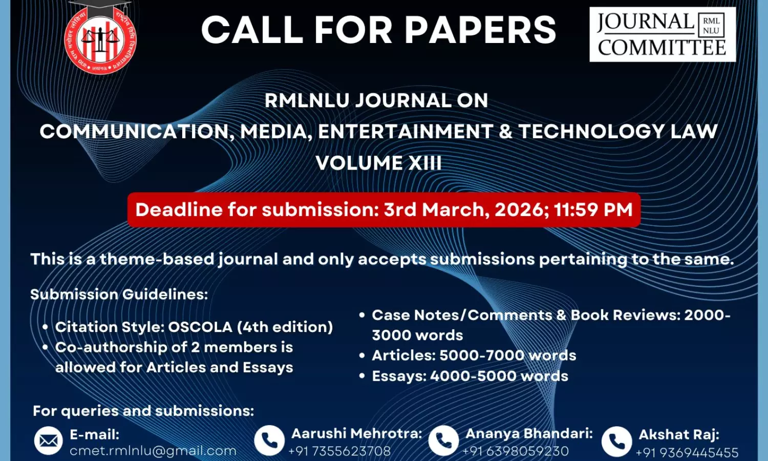 Call For Papers: RMLNLU Journal On Communication, Media, Entertainment & Technology Law [Volume 13]: Submit By 3rd March, 2026