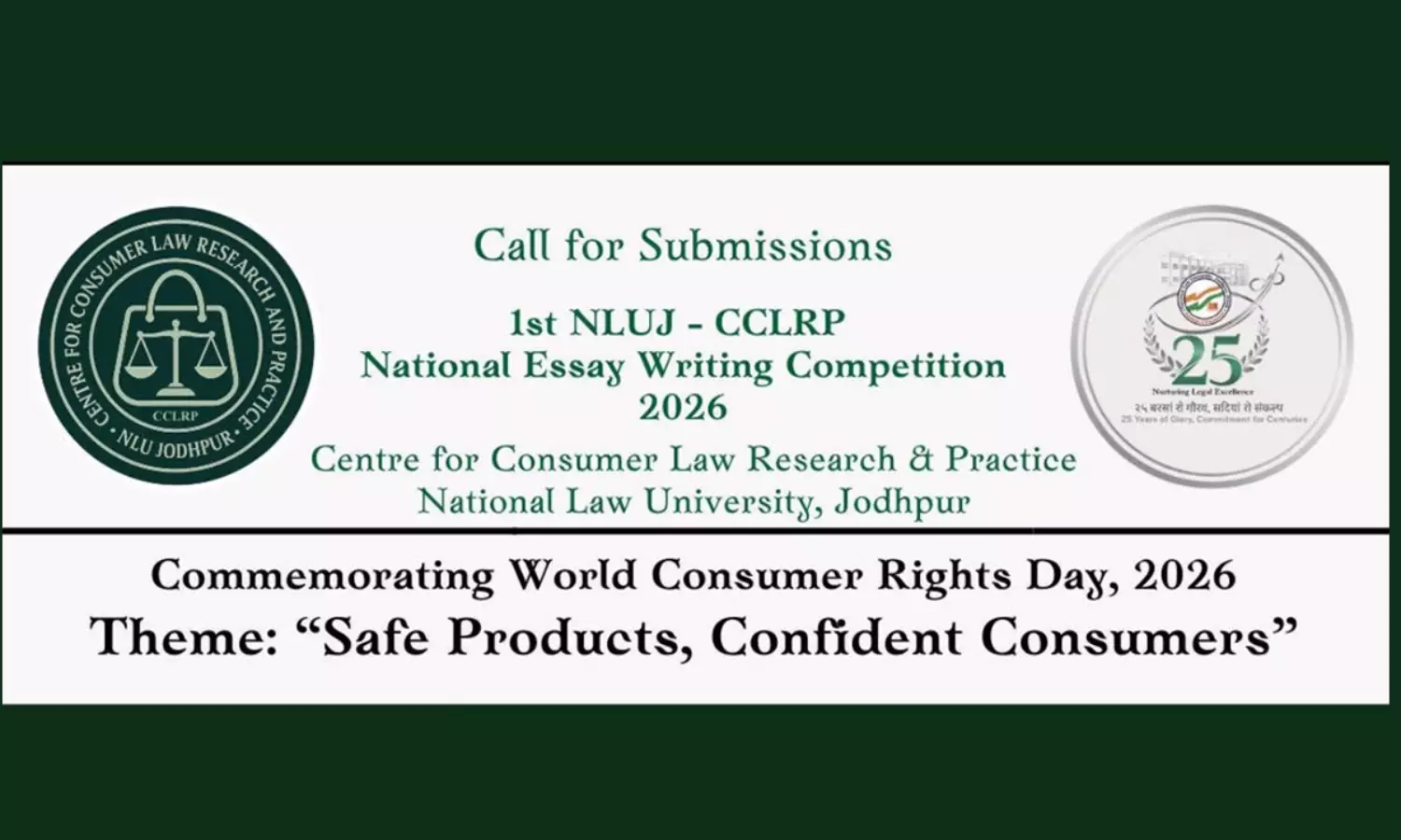 National Law University, Jodhpur – through the Centre for Consumer Law Research and Practice (CCLRP) – is organising the 1st NLUJ-CCLRP National Essay Writing Competition, 2026 to commemorate World Consumer Rights Day on 15th March, 2026. Focusing on the theme for World Consumer Rights Day, 2026 – “Safe Products, Confident Consumers”, the competition aims to promote research and academic discourse on crucial issues such as product quality, safety, and reliability. The competition is open to students pursuing a three-year or five-year law degree course. Winning entries shall be awarded a Certificate of Merit along with cash prizes.