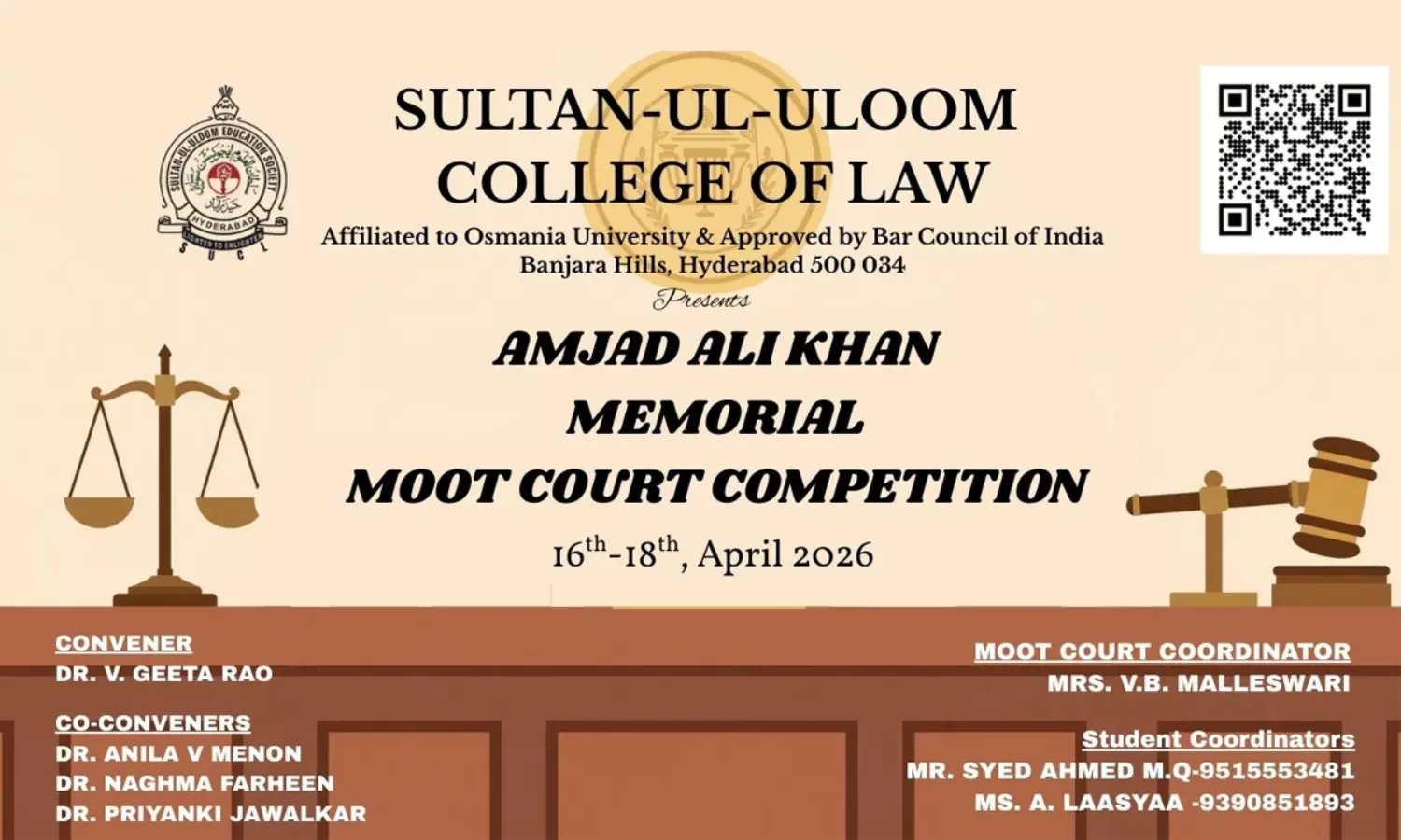 The Sultan-Ul-Uloom College of Law, Hyderabad, is organizing the Amjad Ali Khan Memorial Moot Court Competition 2026, a prestigious national-level moot court competition that brings together talented law students from institutions across India.