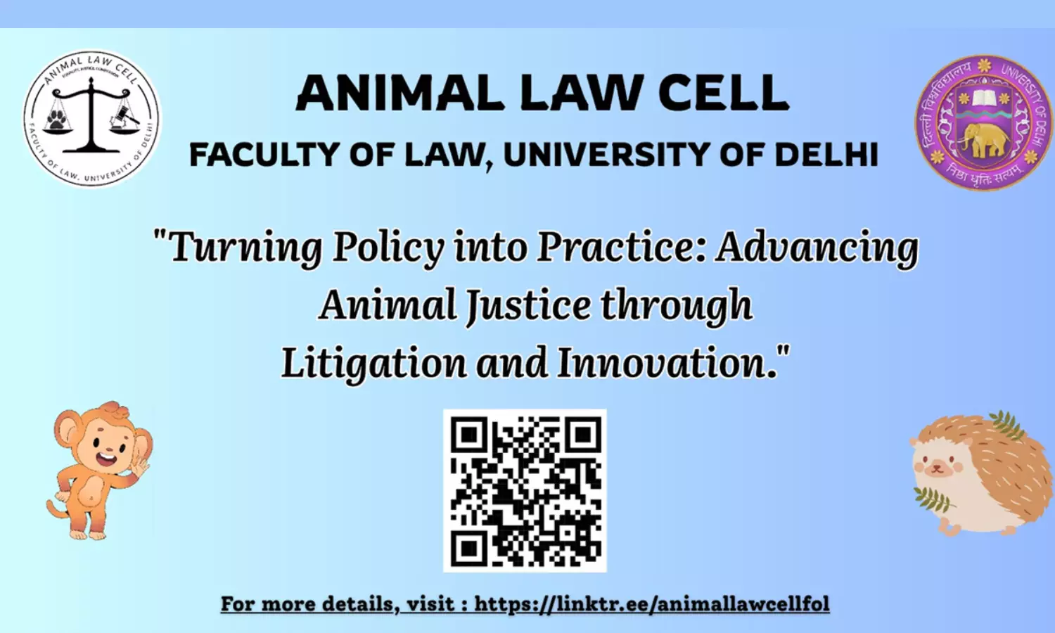The Animal Law Cell, Faculty of Law, University of Delhi, cordially invites the legal fraternity to an academic conference titled "Turning Policy into Practice: Advancing Animal Justice through Litigation and Innovation".