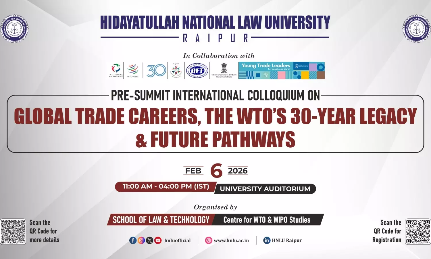 To commemorate the 30th anniversary of the World Trade Organisation (WTO), Hidayatullah National Law University, Raipur, through its Centre for WTO & WIPO Studies, School of Law and Technology, in collaboration with the WTO Young Trade Leaders Programme and the Centre for Trade and Investment Law, IIFT, the Ministry of Commerce and Industry, Government of India under the 'WTO Chairs Program' is set to host a three-day in-person International Trade Law Summit titled 'The WTO@30 Summit' from October 2-4, 2026. This Summit is designed as an outreach of the 'WTO Young Trade Leaders Program' and aims to foster global trade awareness and career opportunities for young professionals.