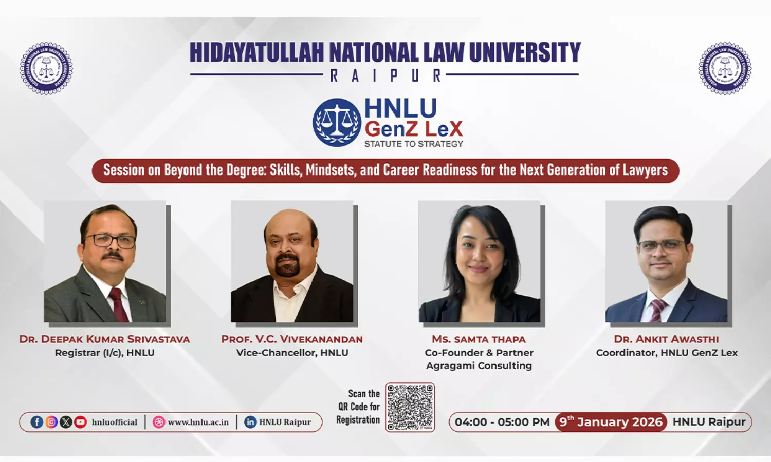 Hidayatullah National Law University (HNLU), Raipur, has launched “HNLU Gen Z–Lex”, a forward-looking digital platform aimed at bridging the long-felt gap between legal academia and professional practice. Conceived as a high-impact, regular engagement forum, the initiative seeks to move students seamlessly from statute to strategy, aligning classroom learning with the realities of contemporary legal practice.