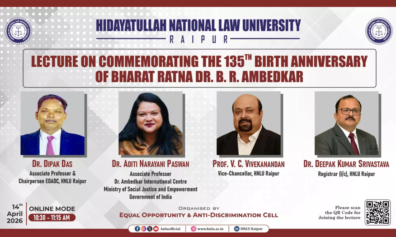 Hidayatullah National Law University, Raipur, through its Equal Opportunity & Anti-Discrimination Cell (EOADC), organised an online lecture on “Commemorating the 135th Birth Anniversary of Bharat Ratna Dr. B. R. Ambedkar” on April 14, 2026. The programme commenced with a floral tribute ceremony at the statue of Dr. B. R. Ambedkar at the Academic Block, followed by the online lecture held from 10:30 AM to 11:15 AM.