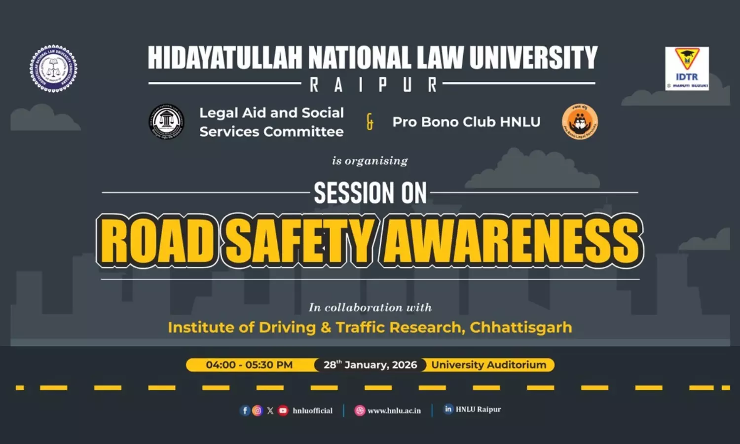 Hidayatullah National Law University (HNLU), Naya Raipur, organized a Road Safety Awareness Session on 28 January 2026 in collaboration with the Institute of Driving and Traffic Research, Chhattisgarh (IDTR-CG). The programme formed part of the nationwide observance of National Road Safety Month (1–31 January) under the Ministry of Road Transport and Highways, Government of India. The event was conducted under the aegis of the Legal Aid and Social Services Committee and the Pro Bono Club, HNLU.