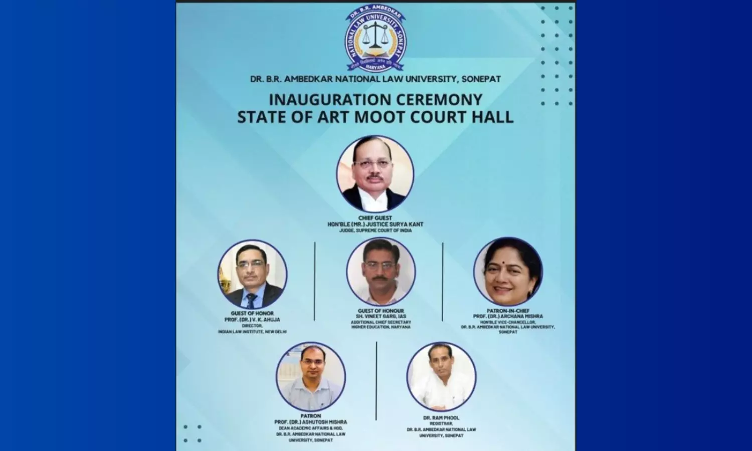 Justice Surya Kant, Judge of the Supreme Court of India, will be attending as the Chief Guest at the Inauguration Ceremony of the State of Art Moot Court Hall at Dr. B.R. Ambedkar National Law University, Sonepat. The event is scheduled to take place on 30th March 2024 at 2:00 p.m.