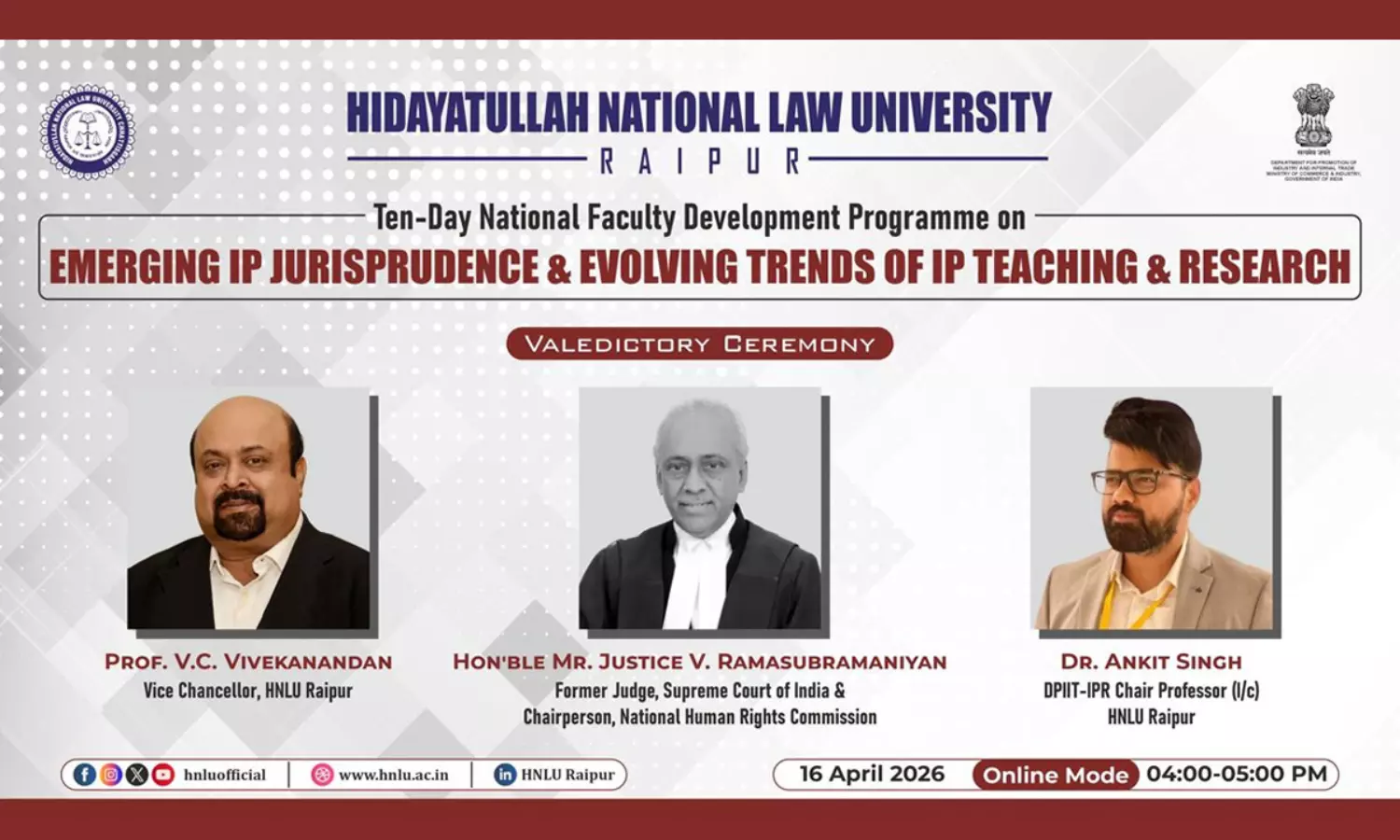 Hidayatullah National Law University (HNLU), Raipur, under the aegis of its DPIIT–IPR Chair, concluded its ten-day National Faculty Development Programme (FDP) on “Emerging IP Jurisprudence and Evolving Trends of IP Teaching & Research” with a valedictory session.
