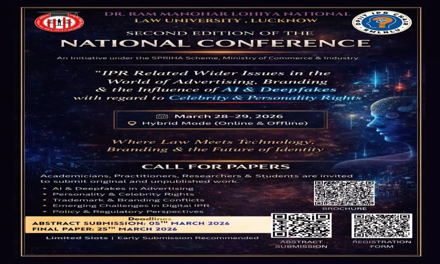 Against this backdrop, the DPIIT IPR Chair at Dr. Ram Manohar Lohiya National Law University (RMLNLU), Lucknow proposes to organize the Second Edition of the National Conference on 28-29 March 2026. The conference aims to provide a multidisciplinary platform for legal scholars, policymakers, industry professionals, technologists, and students to critically examine the evolving interface between intellectual property law, advertising practices, branding strategies, and emerging AI-driven technologies.