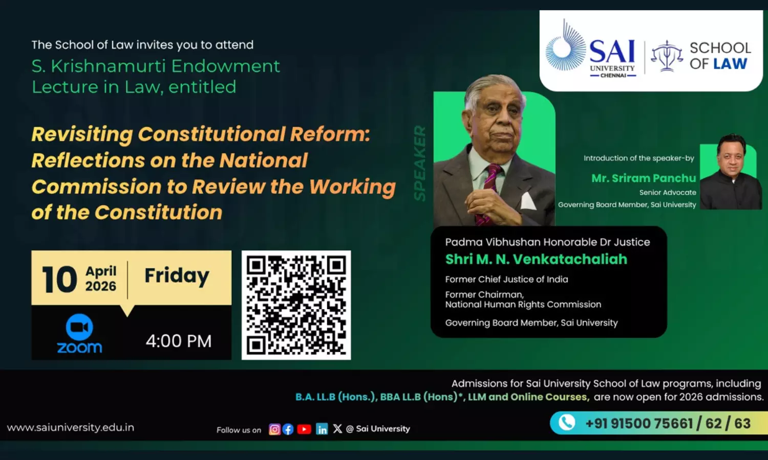 Sai University's School of Law invites you to a distinguished lecture in law featuring eminent jurist Justice M.N. Venkatachaliah, Former Chief Justice of India, as part of the prestigious S. Krishnamurti Endowment Lecture Series.