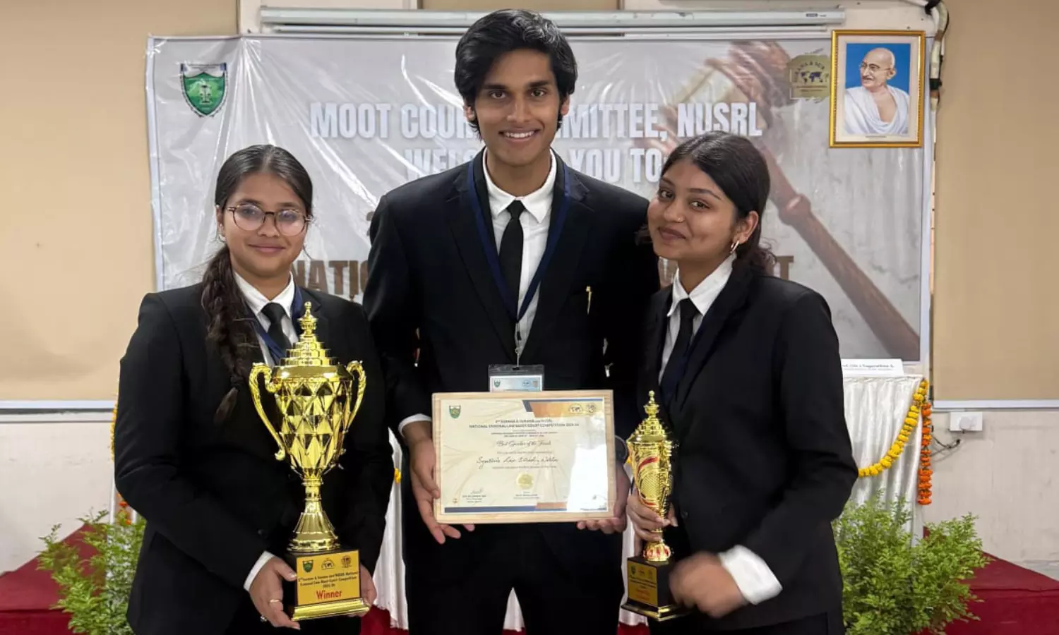 The Overall Winning Team comprised Upmanyu Das, Vedanshi Gupta, and Nandika Aggarwal from Symbiosis Law School, Noida, a constituent of Symbiosis International (Deemed University), Pune. The team demonstrated consistent excellence across the preliminary rounds, quarter-finals, semi-finals, and the final round. In the finals, Nandika Aggarwal and Upmanyu Das appeared as speakers with Vedanshi Gupta as researcher, delivering strong oral arguments before the bench. Upmanyu Das was also awarded the Best Speaker Award in the Finals, while the team secured the Second Best Memorial Award.