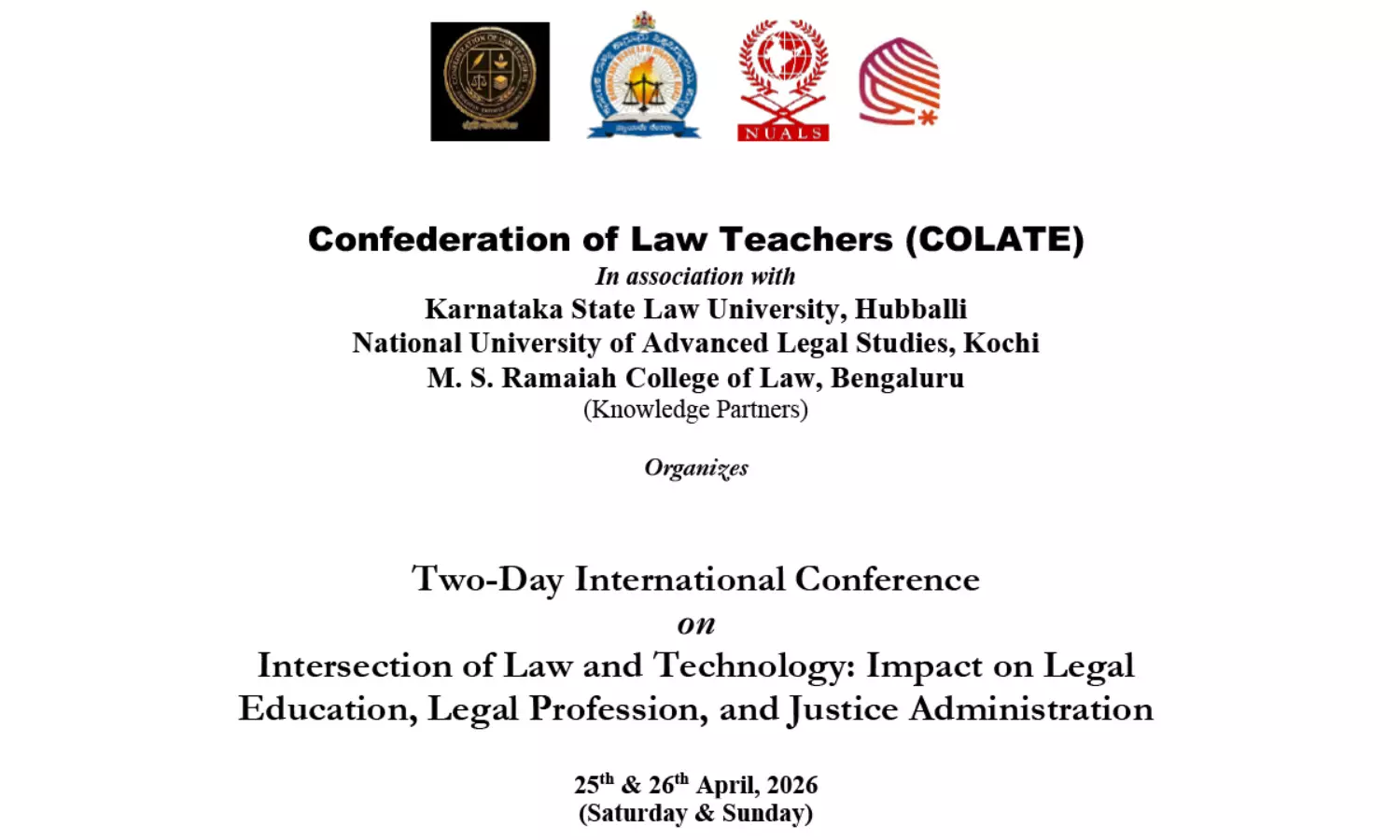 The Confederation of Law Teachers (COLATE), in association with Karnataka State Law University, Hubballi, National University of Advanced Legal Studies (NUALS), Kochi, and M. S. Ramaiah College of Law, Bengaluru, is set to organise a two-day International Conference on “Intersection of Law and Technology: Impact on Legal Education, Legal Profession, and Justice Administration” on April 25–26, 2026, at Ramaiah College of Law, Bengaluru.
