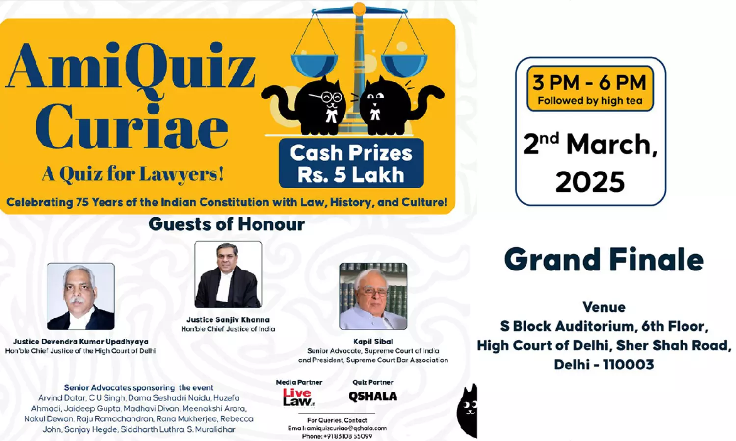 The Grand Finale of the AmiQuiz Curiae National Legal Quiz will be held in New Delhi on March 2, 2025. The quiz is a tribute to the 75th anniversary of the Indian Constitution.