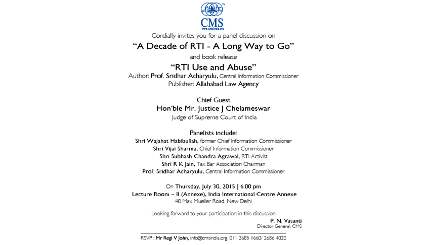 CMS is organizing a panel discussion on “ A Decade of RTI- A Long Way To Go” and book release “ RTI Use and Abuse”.The author of the book is Prof Sirdhar Acharyulu, Central Information Commissioner and Allahabad Law Agency is publishing the book.Hon’ble Mr. Justice J Chelameswar, Judge of Supreme Court of India is the Chief Guest. The Panelist are :-ShriWajahatHabibullah, former...