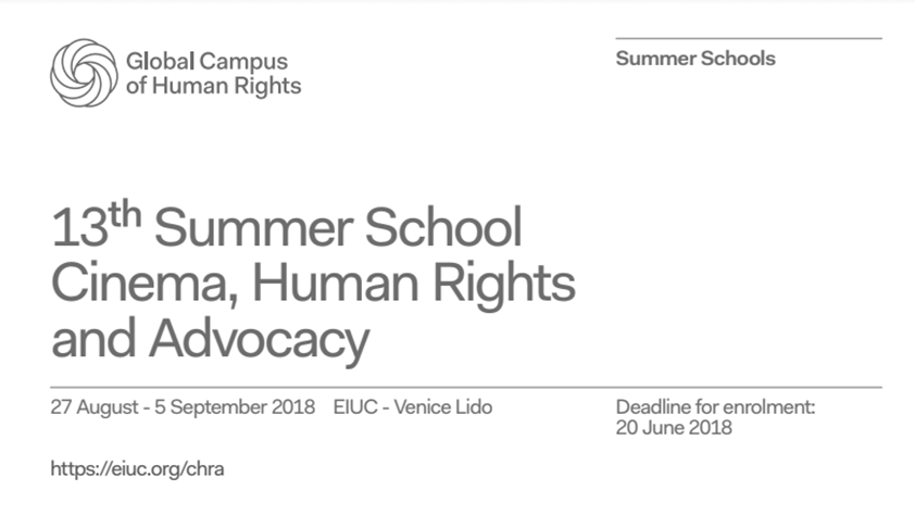 The 13th edition of the Summer School in Cinema Human Rights and Advocacy is a training initiative jointly developed by EIUC and CHRA. The 10-day intense training is aimed at young professionals wishing to broaden their understanding on the connections between human rights, films, digital media and video advocacy, to share ideas and foster participatory and critical thinking on urgent human rights issues, debate with experts and filmmakers from all over the world during the 75th Venice International Film Festival and learn how to use films as a tool for social and cultural change.