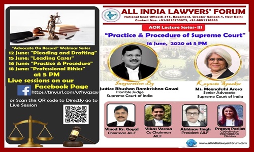 All India Lawyers' Forum is organizing an Online Learning Session, AOR Lecture Series III. Date: 16th June 2020 Time: 5:00 PM Theme: Practice & Procedure of Supreme Court The session will be inaugurated by Hon'ble Mr. Justice B. R Gavai, Judge, Supreme Court of India. Keynote Speaker: Mrs. Meenakshi Arora, Senior Advocate, Supreme Court of India The welcome...