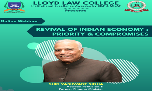 Lloyd Law College is organizing a live webinar on "Revival of Indian Economy: Priority and Compromises". Speaker: Yashwant Sinha, Veteran Politician and Former Finance Minister Date: 20th May, 2020 Time: 3:45 PM To register, click here. Brief Speaker Profile: The former Finance Minister Shri Yashwant Sinha completed his early and higher education from Patna. After...