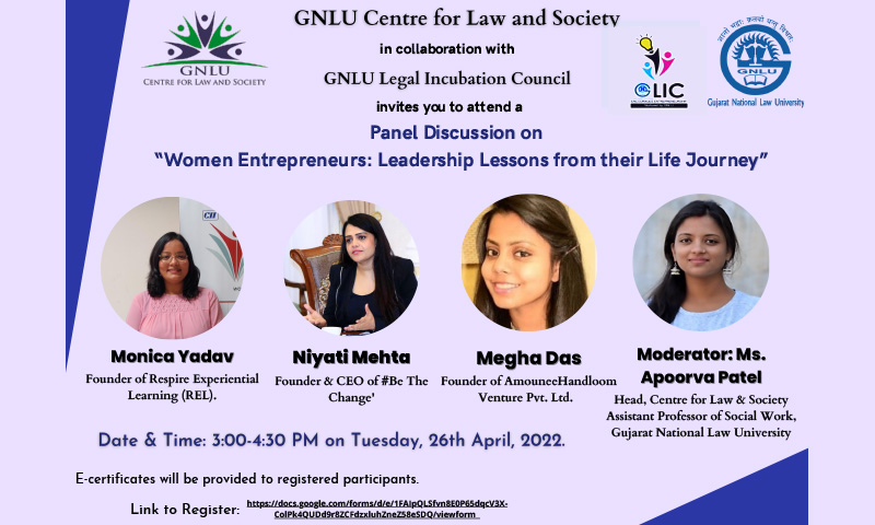 GCLS is organizing a Panel Discussion on the theme of 'Women Entrepreneurship: Leadership Lessons from their Life Journey' on the 26th of April, 2022 from 3-4:30 PM. Everyone is cordially invited to attend the Panel Discussion and inform other interested participants to join in for the same. Kindly note that e-certificates will be provided to the registered participants. For the...