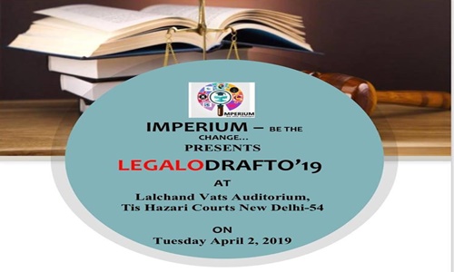 Imperium- be the change is organising Legaldrafto, a Seminar on Legal Drafting. Date: 2nd April 2019 Venue: Lalchand Vats Hall, Tis Hazari Court, Delhi Time: 12 noon (reporting time 11:45 AM) Eligibility: All students, scholars and researchers interested in drafting of legal documents. Registration fee: Rs.300 Deadline of registration: 26th March 2019 Panel of...