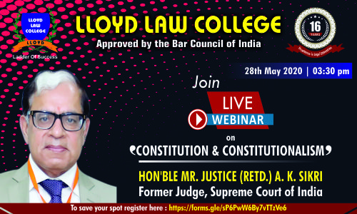 Lloyd Law College is organising a webinar on the Constitution of India. Theme: Constitution and Constitutionalism Speaker: Justice (Retd.) A.K. Sikri; Former Judge, Supreme Court of India Date: 28th May Time: 3:30 PM The webinar is free of cost and open for all. To register, click here.About Justice A.K SikriA thinker, a philosopher, a teacher, Justice AK Sikri has...