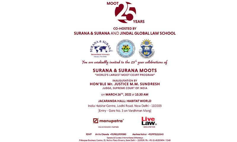 Moot 25 Conclave: Co-hosted by Surana & Surana International Attorneys & Jindal Global Law School. The Conclave will be held at the India Habitat Centre on March 26, 2022.The Inauguration at 10.30 AM will be done by Chief Guest, Justice M M Sundresh, Judge, Supreme Court of India, will be followed by a Special Address by Dr Abhishek Manu Singhvi, Senior Advocate, Supreme Court of...