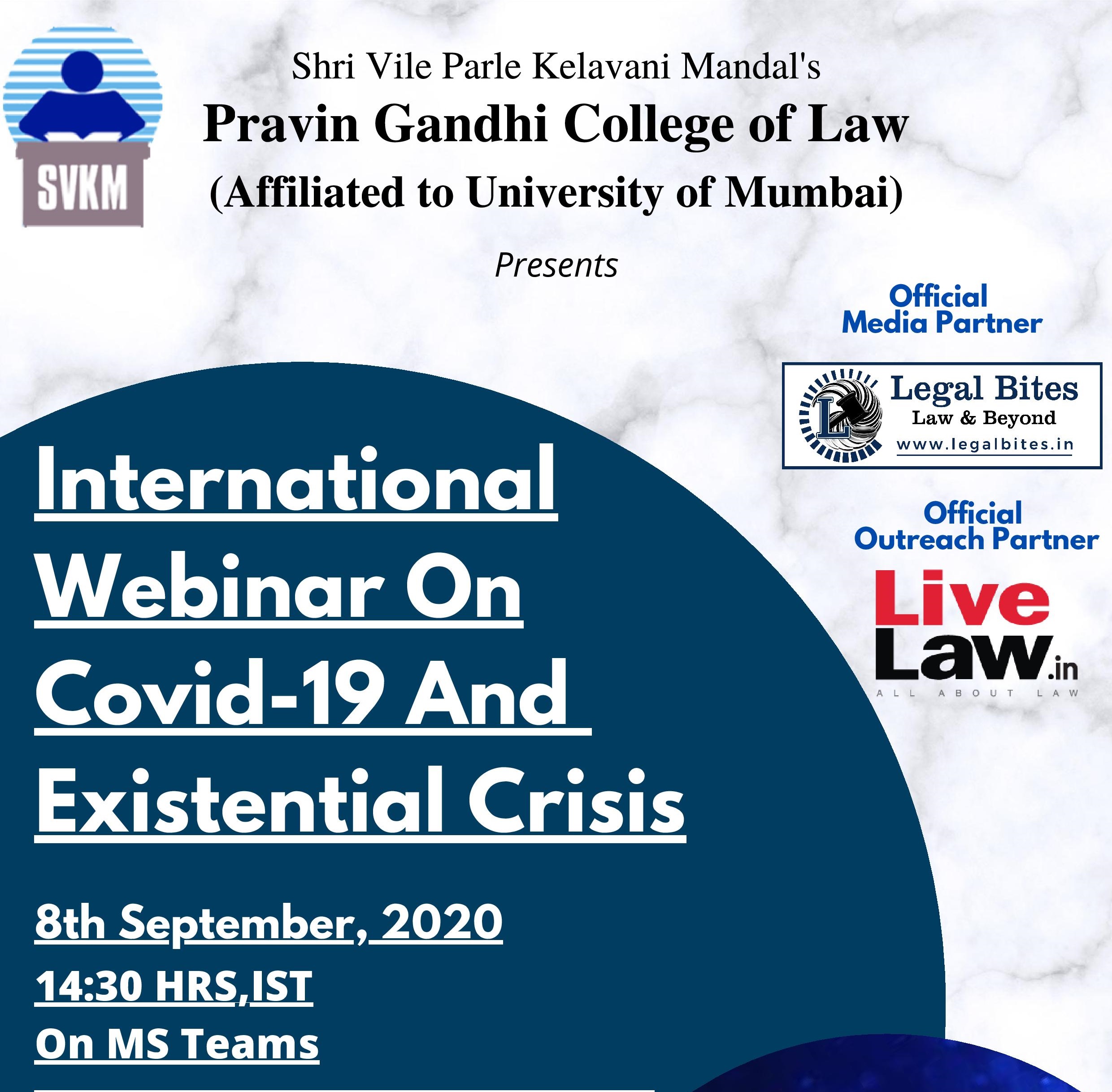SVKM's Pravin Gandhi College of Law is organising an International Webinar on COVID-19 and Existential Crisis. Date: 8th September 2020 Time: 2:30 pm onwards Speakers: Mr. Manojkrishna Pillai Ms. Laura Vanessa Munoz Ms. Carolynn Keenan Mr. Gary Davidson Platform: MS Teams (Link would be provided on the telegram group after registration). Queries can...