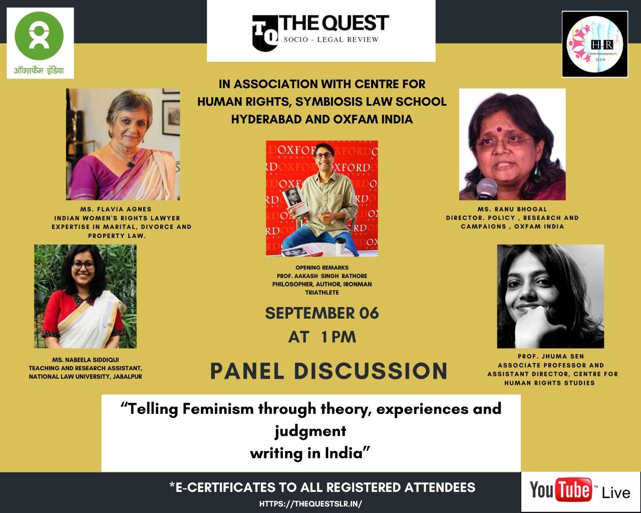 The Quest (Socio Legal Review), OXFAM India and The Centre for Human Rights, Symbiosis Law School, Hyderabad are organising a panel discussion on feminism. Date: 6th September 2020 Time: 1:00 PM Theme: Telling feminism through theory, experiences and judgement writing in India Speakers: Flavia AgnesNabeela SiddiquiRanu BhogalJhuma Sen Opening Remarks:...