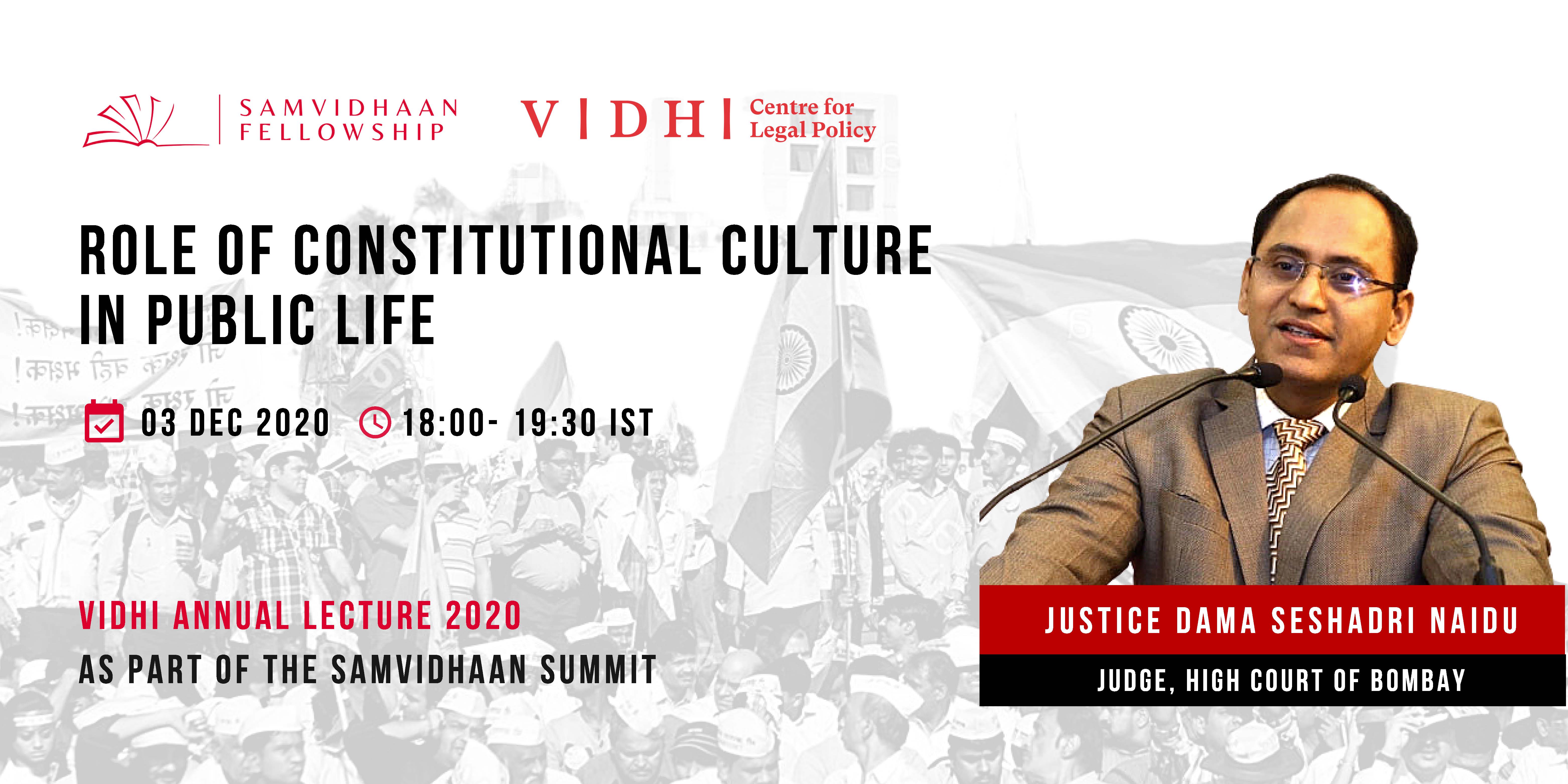 Vidhi's Fourth Annual Lecture will be delivered by Justice Dama Seshadri Naidu of the Bombay High Court on 3rd December 2020 (Thursday) at 6 PM. Justice Naidu will be speaking on the 'Role of Constitutional Culture in Public Life'. The Vidhi Annual Lecture is an initiative by the Vidhi Centre for Legal Policy that seeks to provide a platform to noted public intellectuals to speak...