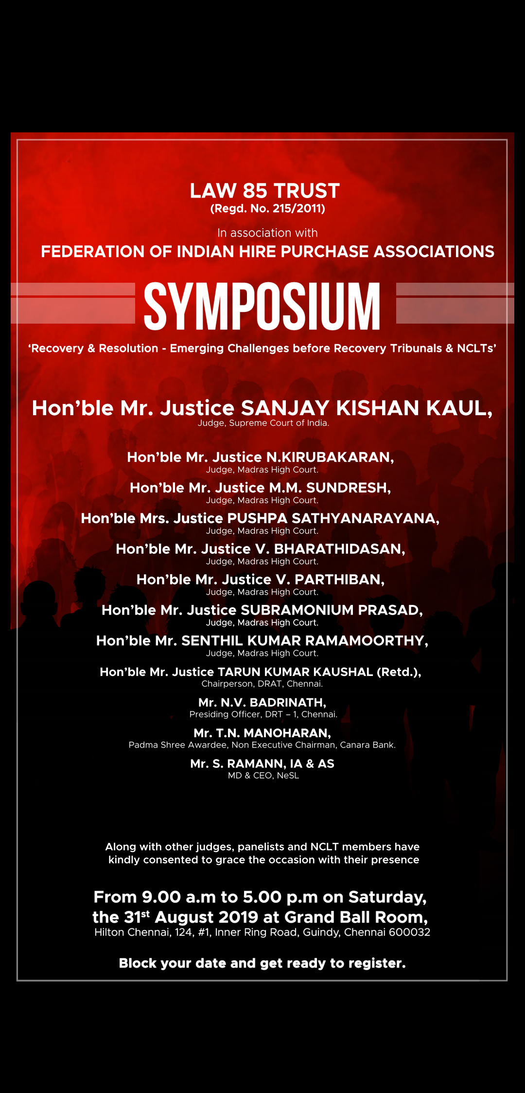'Law 85 Trust' in association with the 'Federation of Indian Hire Purchase Association' (FIHPA) is organising a Symposium on the topic 'Recovery & Resolution – Emerging Challenges before Recovery Tribunals and NCLTs'. Senior judges including Hon'ble Justice Mr. Sanjay Kishan Kaul (Judge, Supreme Court of India), Hon'ble Justice Mr....
