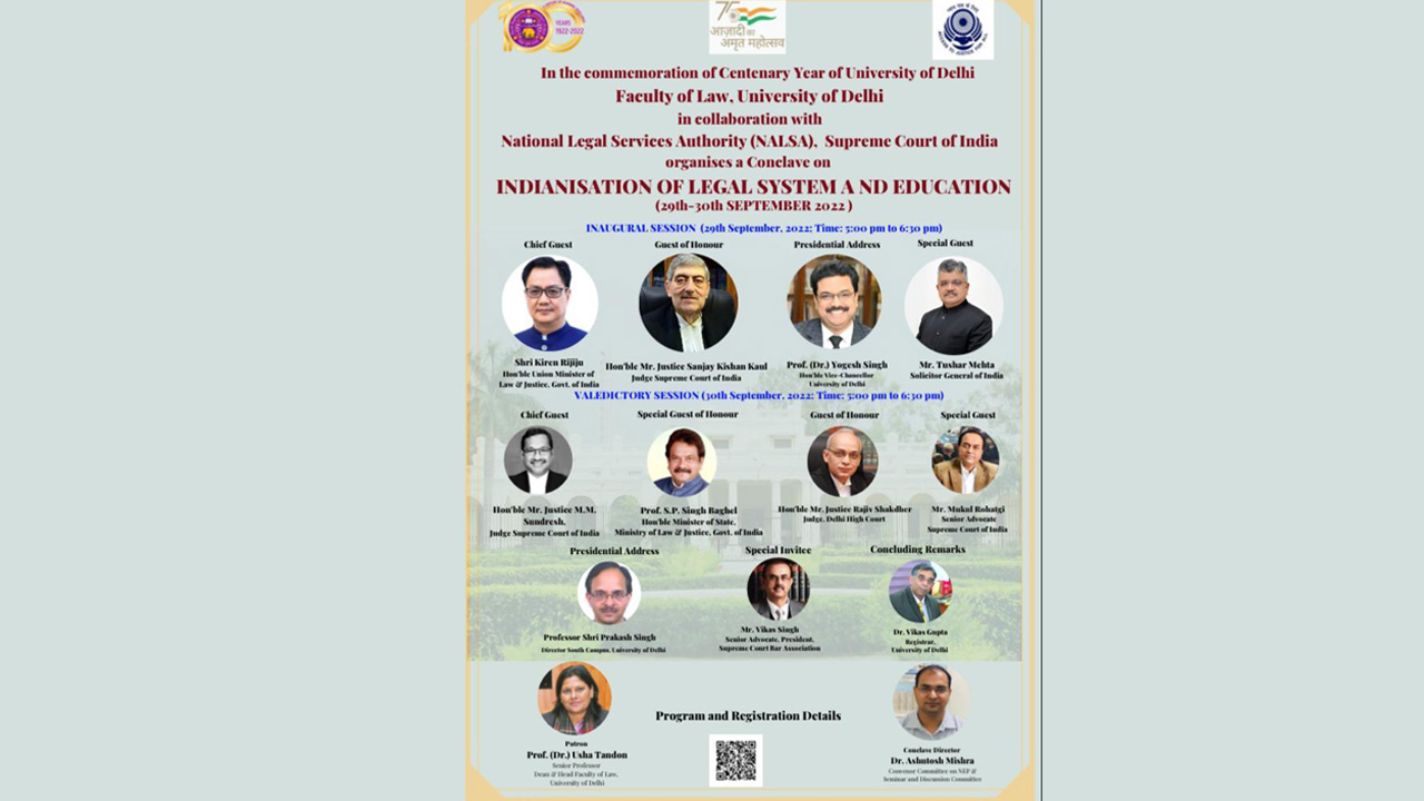 In the Commemoration of Centenary year of University of Delhi - Faculty of Law, University of Delhi in collaboration with National Legal Services Authority (NALSA), Supreme Court of India has organised a CONCLAVE ON INDIANISATION OF LEGAL SYSTEM AND EDUCATIONIntroduction of the Conclave:India has had a great history of fair, speedy and efficacious Justice delivery system. Our Vedic...