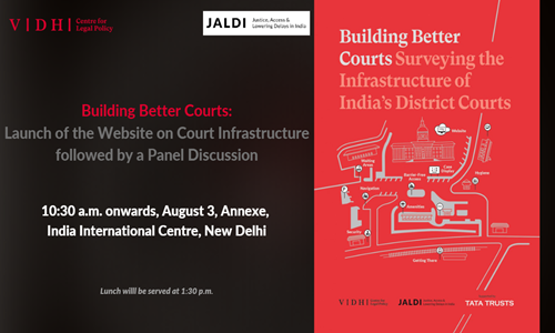Vidhi Centre for Legal Policy is organizing Building Better Courts: Launch of Website on Court Infrastructure and Panel Discussion. Date: 3rd August Time: 10:30 AM Venue: Annexe, India International Centre, Annexe Vidhi commissioned a pan-India survey (of 665 district courts) and interviewed 6650 litigants (10 per district) to understand the status of physical infrastructure...