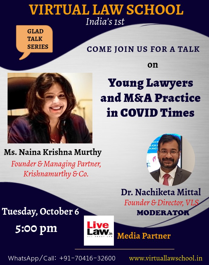 Virtual Law School (VLS) is organising a of Global Legal Approaches & Development Talk (GLAD Talk). Speaker: Naina Krishna Murthy, Founder & Managing Partner, Krishnamurthy & Co. Topic: Young Lawyers and M&A Practice in COVID-19 Times Date: October 6, 2020 Time: 5:00 PM (IST) About Ms. Krishnamurthy's GLAD TALK: This subject matter is relevant for most of...