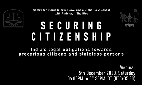 Centre for Public Interest Law, Jindal Global Law School invites you to the 'Securing Citizenship' webinar, hosted in partnership with Parichay – The Blog. The webinar will foster engagement with CPIL's new report titled Securing Citizenship: India's legal obligations towards precarious citizens and stateless persons. Key themes of discussion include Citizenship Status, Detention...