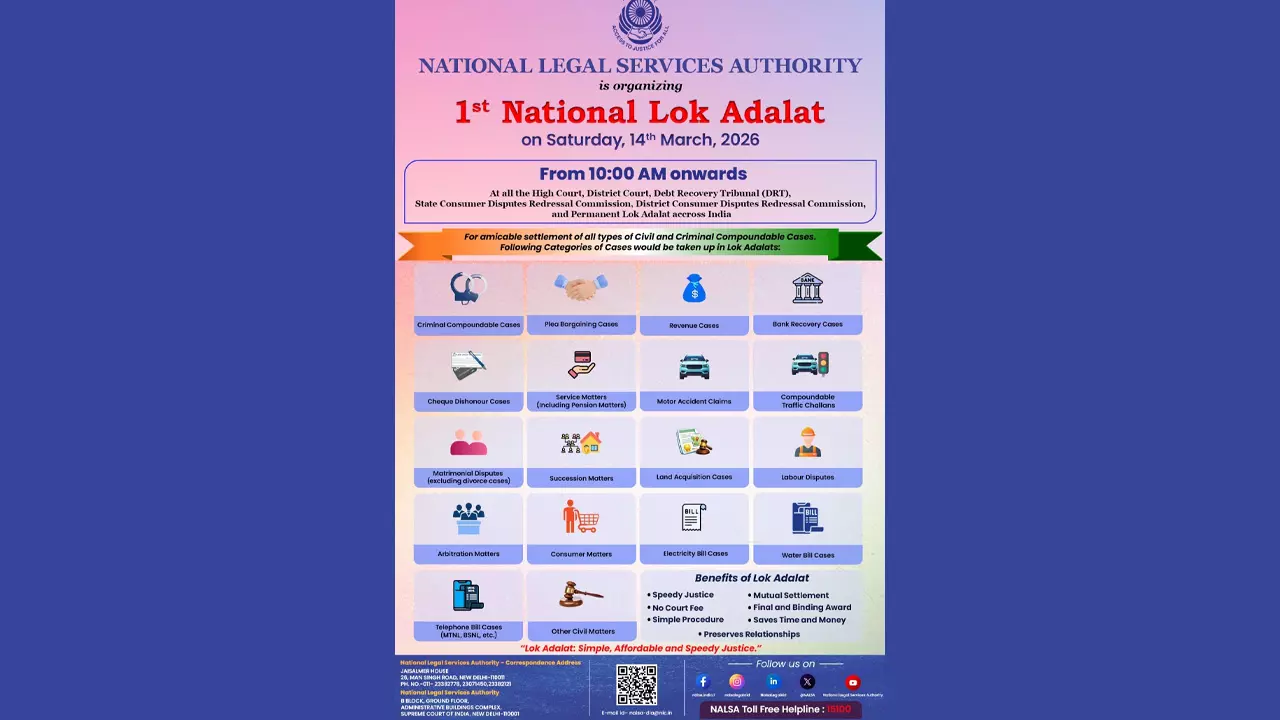The National Legal Services Authority is organising the 1st National Lok Adalat of 2026 on 14 March 2026, in a significant step towards making justice more accessible and affordable.