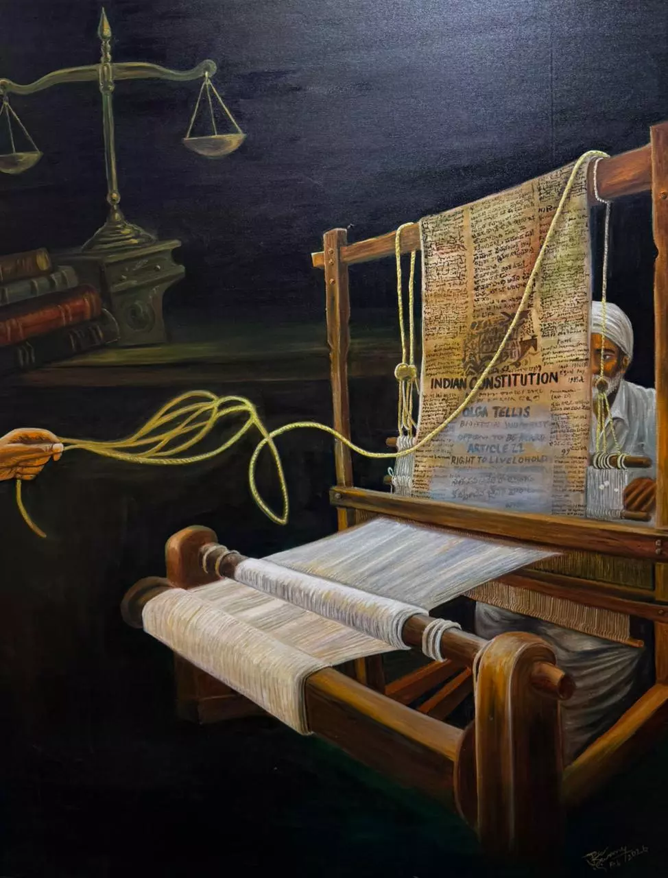 Several paintings drew inspiration from some of the most significant rulings in India's constitutional history. Among them was the Supreme Court's decision in Kesavananda Bharati v. State of Kerala, which established the “basic structure” doctrine, limiting Parliament's power to amend the Constitution. Artists interpreted this doctrine through visual motifs representing balance, resilience, and the foundational pillars of constitutional democracy.
