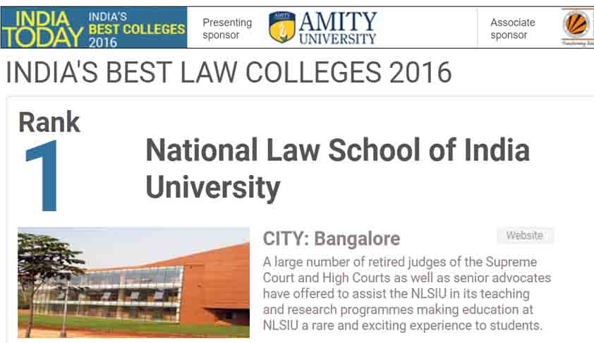India Today released the list of India’s Best Law Colleges, with NLSIU Bangalore retaining the top spot. The only other two NLUs to make it to the top 10 are WBNUJS Kolkata at the third spot and GNLU Gandhinagar at 10th spot. Aligarh Muslim University’s Faculty of Law, Amity Law School Noida and Christ University’s School of Law were placed at the second, fourth and fifth spot respectively.