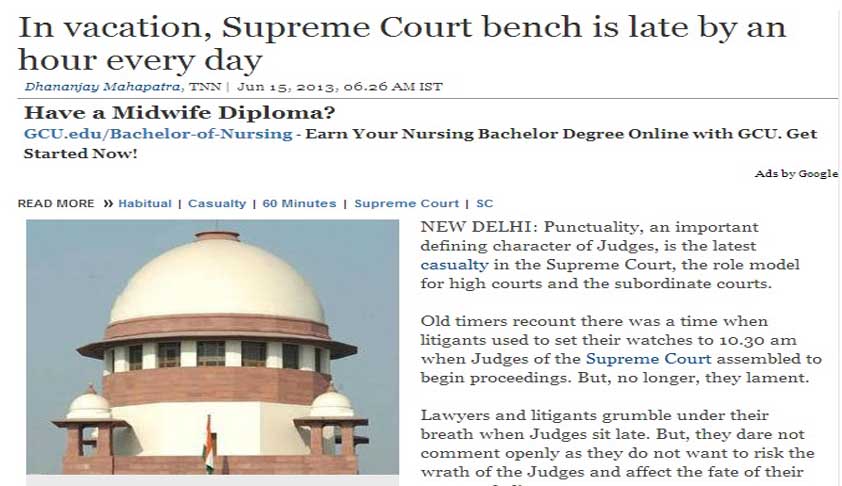On 15th June, 2013 Times of India (TOI) published an article by Dhananjay Mahapatra titled, “In Vacation, SC Bench late by an hour”. The article had a shoulder headline: Justice G S Misra and CJI are habitual late comers.The article further noted, “Chief Justice of India (CJI) Altamas Kabir, who sits in court no. 1, is usually late to the court every day and the bench headed by him...