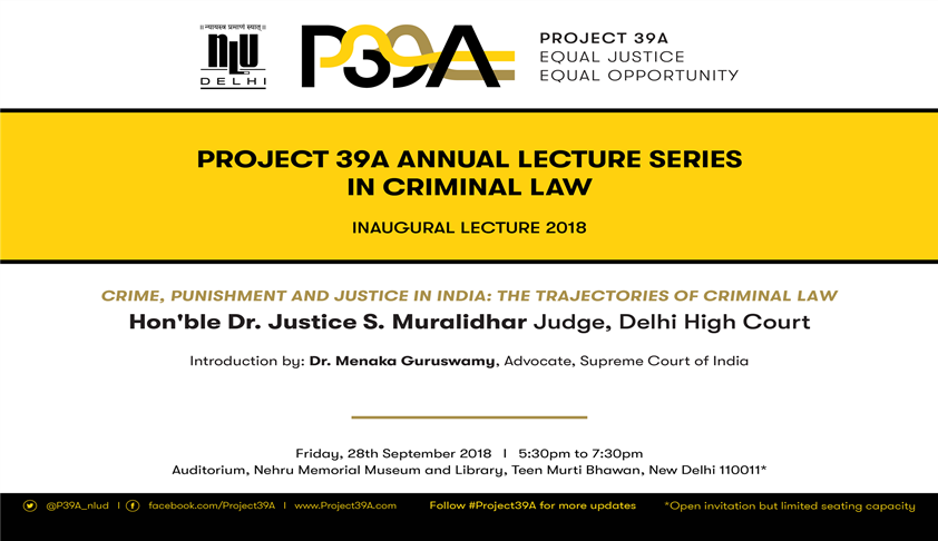 Project 39A (erstwhile Centre on the Death Penalty) at the National Law University Delhi will launch its annual criminal law lecture series on September 28, 2018. Justice Muralidhar will deliver the inaugural lecture on ‘Crime, Punishment and Justice in India: The Trajectories of Criminal Law’.Date: September 28 (Friday)Venue: Nehru Memorial Museum & Library AuditoriumTime: 5:30 PM...