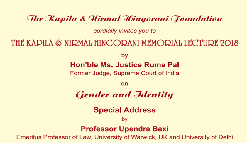 The Kapila and Nirmal Hingorani Foundation has extended invitations for the Kapila and Nirmal Hingorani Memorial Foundation Lecture, 2018.The lecture will be delivered by Justice Ruma Pal, former judge, Supreme Court of India. The lecture will be on the theme ‘Gender and Identity’.Special addresses will be delivered by Prof. Upendra Baxi, D. Sonal Mansingh, and Ms. Lillette Dubey.Date:...
