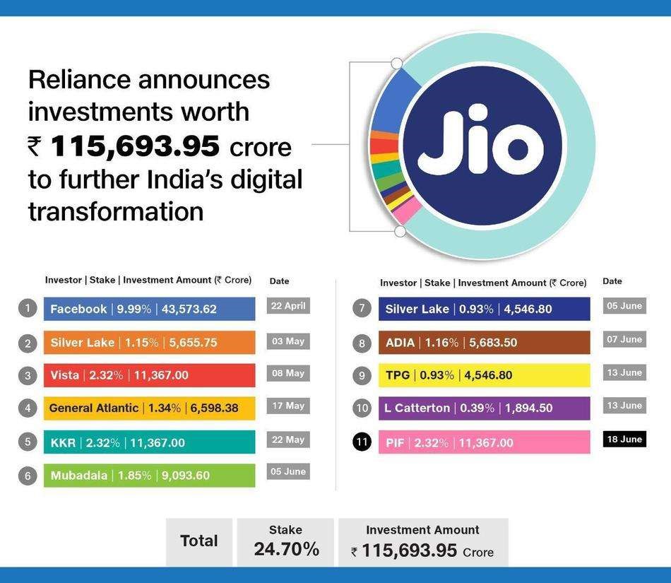 In the last quarter or less, Jio has raised more than ₹ 67,000 Cr i.e. about $9 billion by divesting about 14.8% stake with Facebook investing ₹ 43,574 Cr, Vista Equity ₹ 11,367 Cr, General Atlantic ₹ 6,598.38 Cr, and Silver Lake ₹ 5,655.75 Cr in it. On 18th June 2020 that Saudi Arabia's Public Investment Fund declared intention to invest ₹ 11,367 Cr for a 2.32% stake in Jio. All this will take RILs share value to unscaled heights.