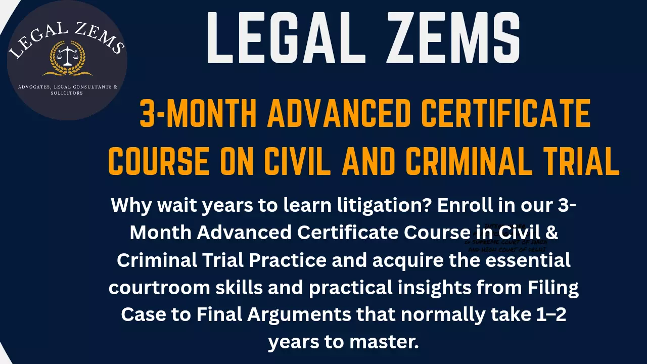 The Legal Zems Advanced Certificate Course in Civil Trial and Criminal Trial is designed to build advocacy-ready professionals by equipping learners with the practical skills required to independently handle civil suits and criminal proceedings. The programme prepares participants for successful careers in litigation law firms, corporate legal departments, and judicial services.