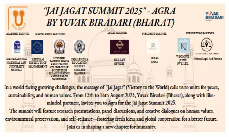The Jai Jagat Summit 2025, hosted by Yuvak Biradari (Bharat) in Agra from August 13–16, 2025, will convene judges, ministers, parliamentarians, advocates, academics, and young leaders to discuss socio-political and environmental issues through keynote addresses, roundtables, debates, and research paper presentations. Emphasizing national integration and the philosophy of "Vasudhaiva Kutumbakam," the summit invites papers on themes like human values, environmental conservation, and self-reliant societies, offering publication opportunities and awards.