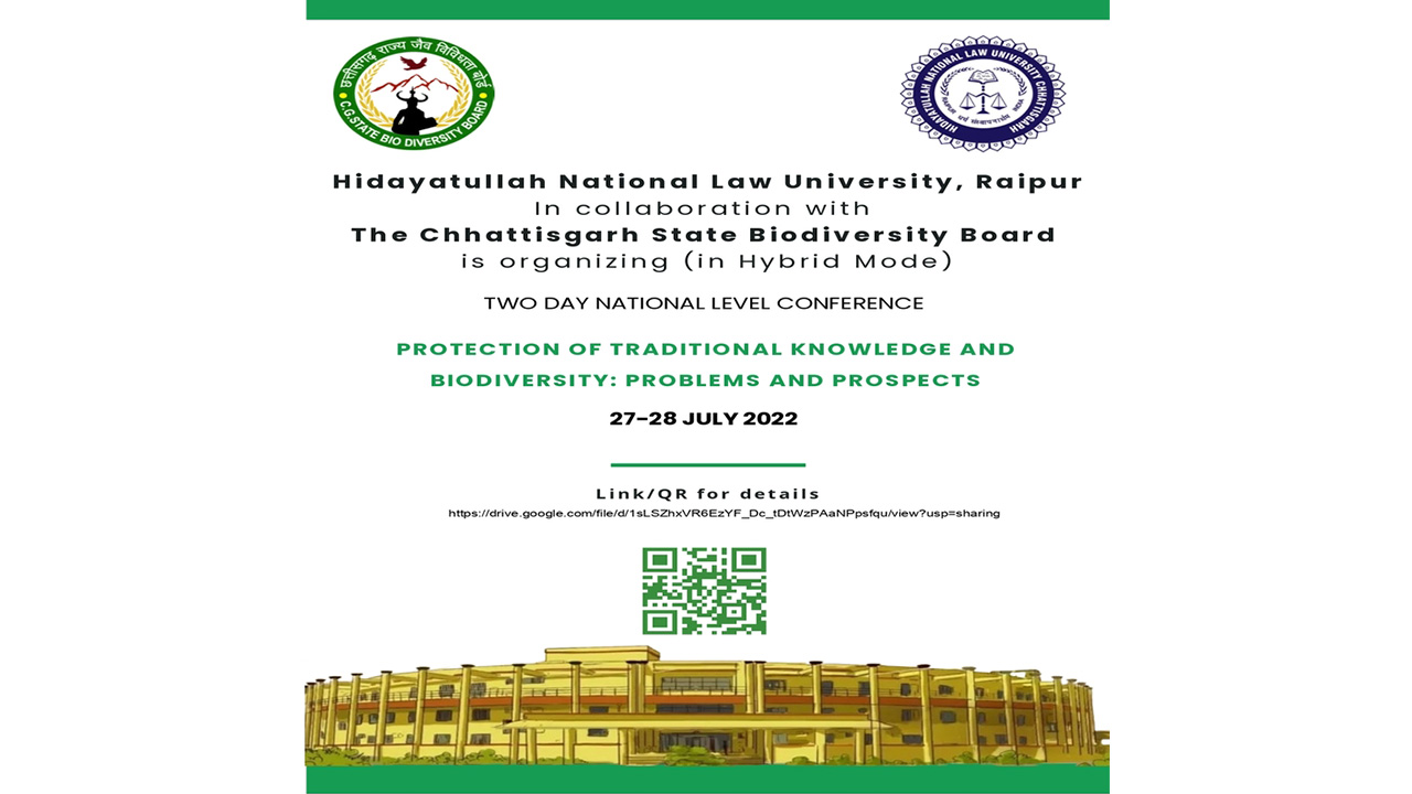 Hidayatullah National Law University and Chhattisgarh State Biodiversity Board to organize a National Conference on Protection of Traditional Knowledge and Biodiversity: Problems and Prospects on 27th & 28th July 2022.