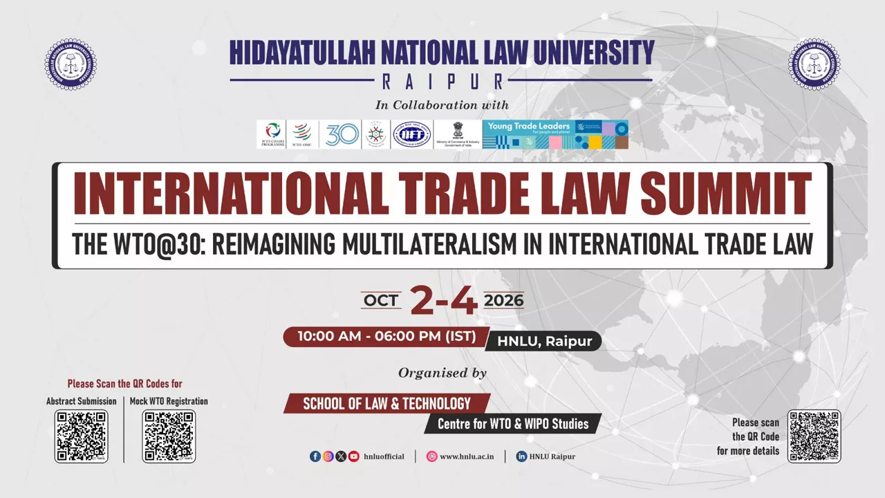 Hidayatullah National Law University (HNLU), Raipur, through its Centre for WTO & WIPO Studies, School of Law and Technology, in collaboration with the WTO Young Trade Leaders Programme and the Centre for Trade and Investment Law (CTIL), IIFT, under the WTO Chairs Programme of the Ministry of Commerce and Industry, Government of India is set to organise International Trade Law Summit on “The WTO@30: Reimagining Multilateralism in International Trade Law,” from 2 - 4 October 2026 in offline mode. To commemorate the 30th anniversary of the World Trade Organization (WTO), this Summit is designed as an outreach of the WTO Young Trade Leaders Programme and aims to foster global trade awareness and career opportunities for young professionals. The event will feature thematic panel discussions and in-person technical sessions showcasing selected research papers and articles. It also includes Mock WTO Exercise (First of its Kind in India) offering students a hands-on experience in multilateral trade diplomacy through a simulation of trade negotiations and resolution drafting. This summit is open to academicians, researchers, professionals, practitioners, and students of law, business and economics from India and the international community.